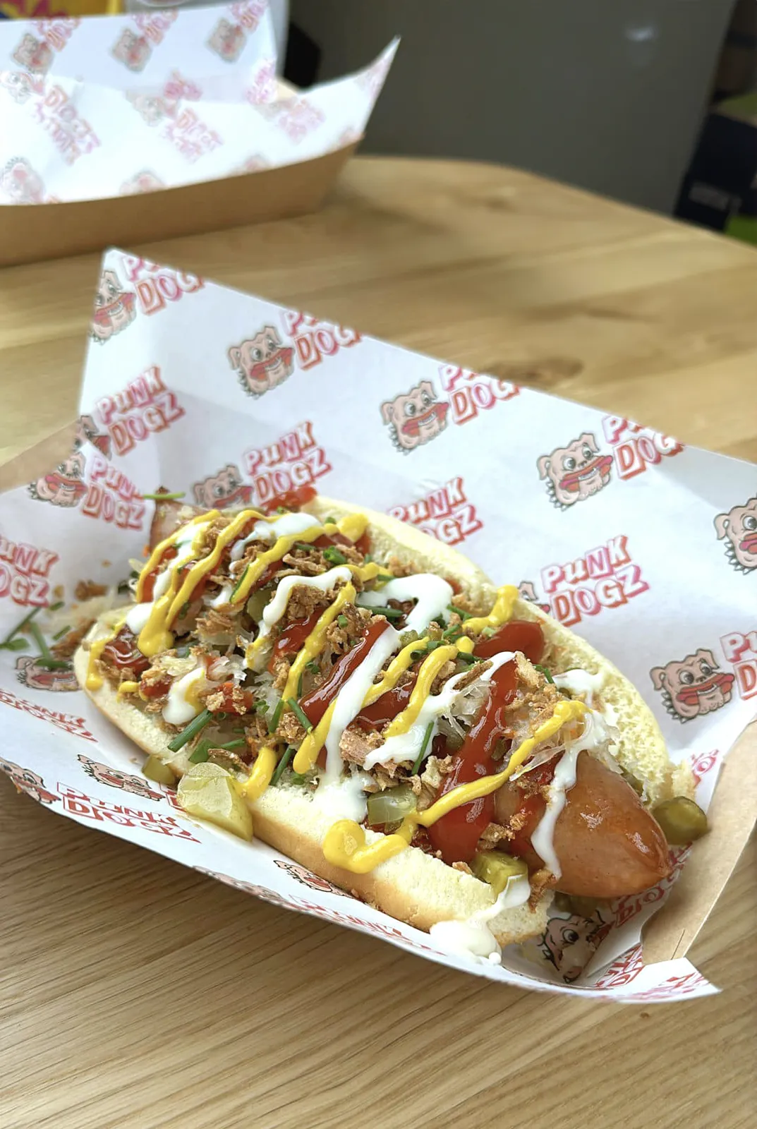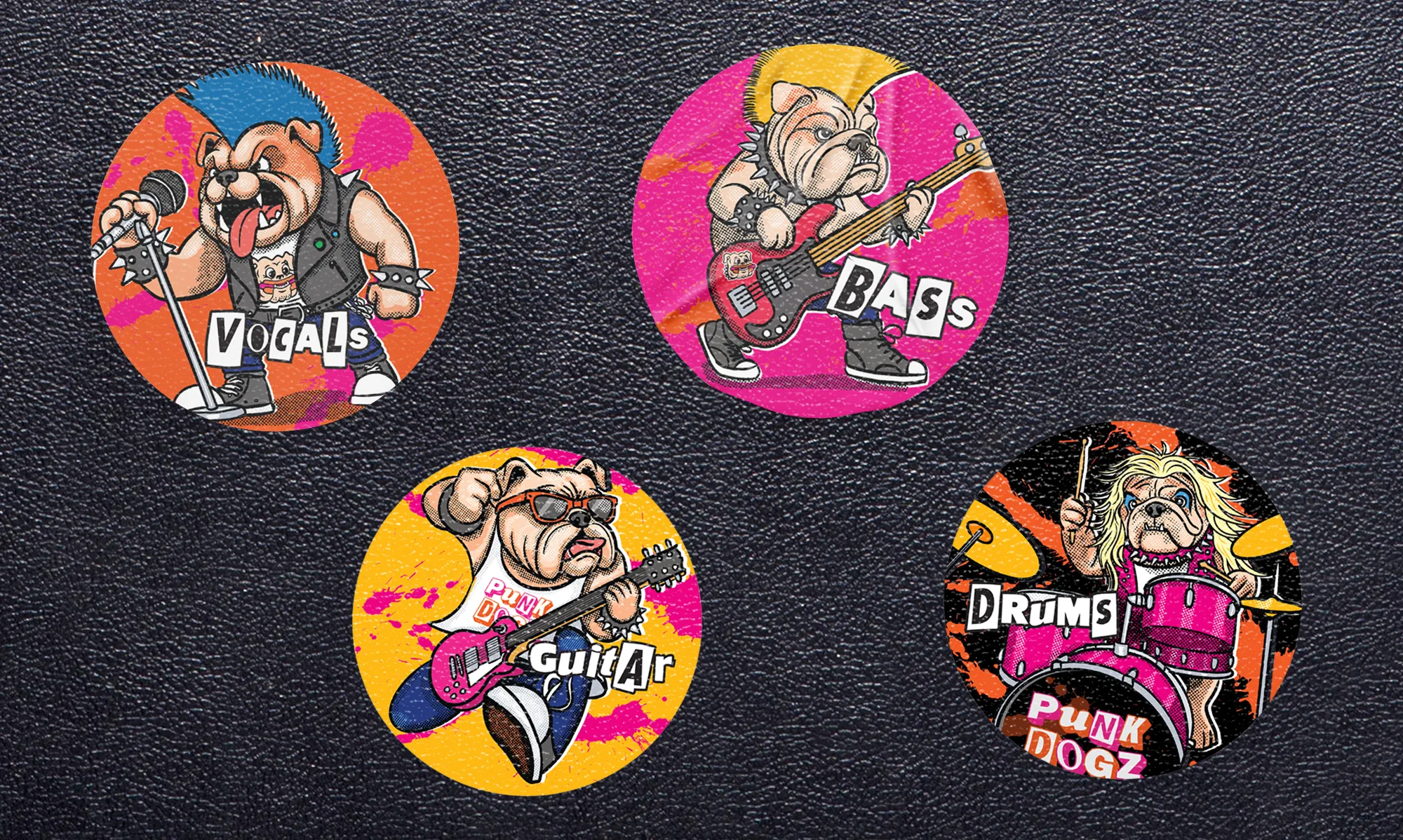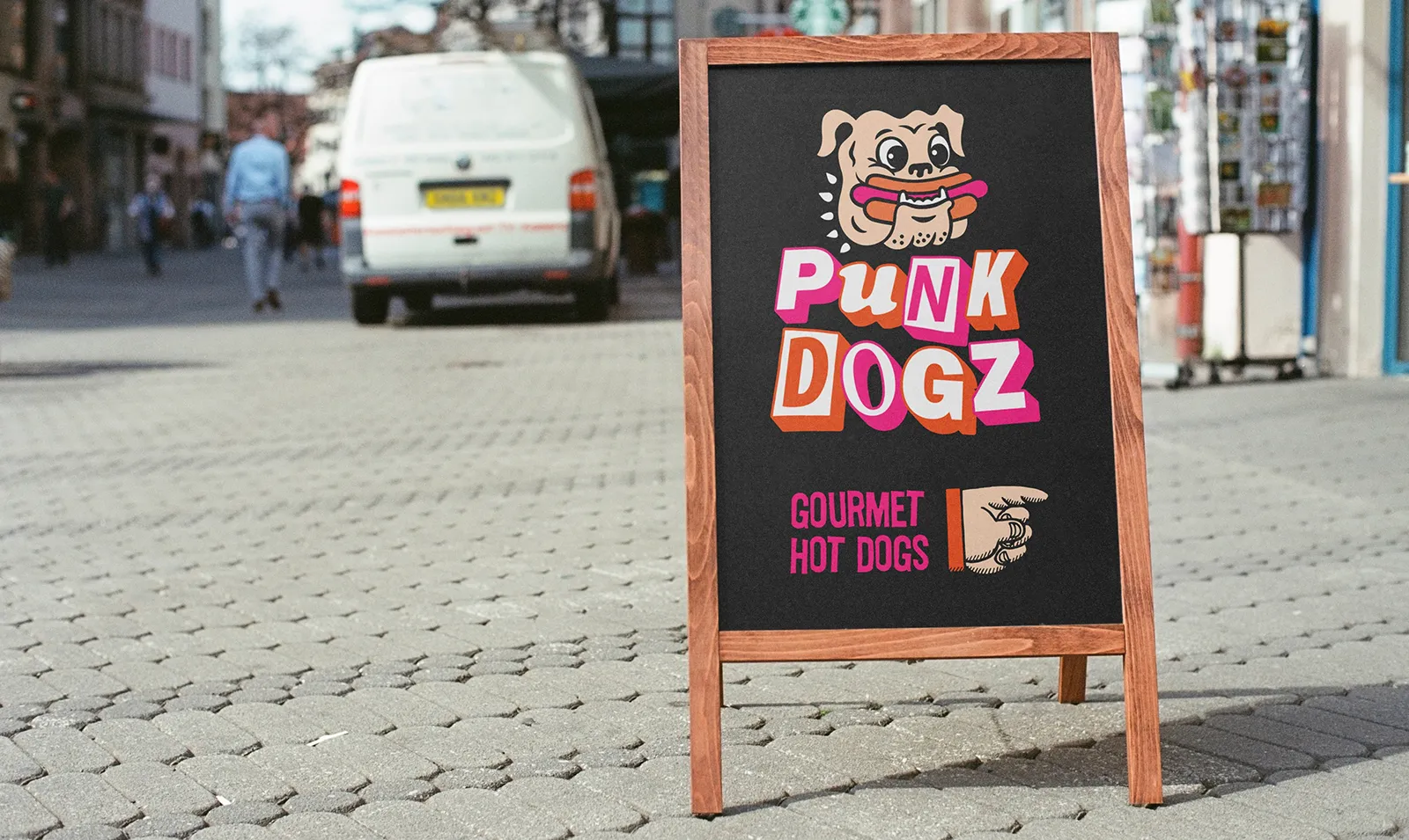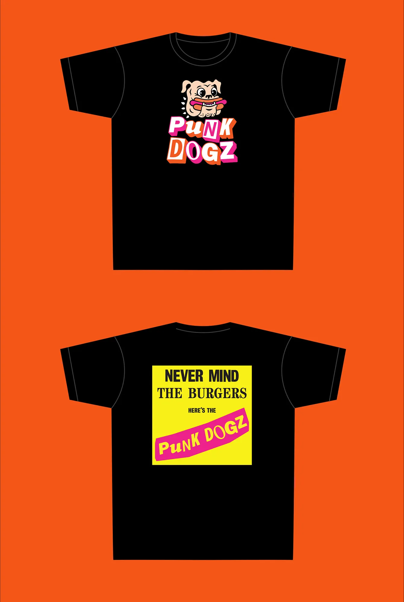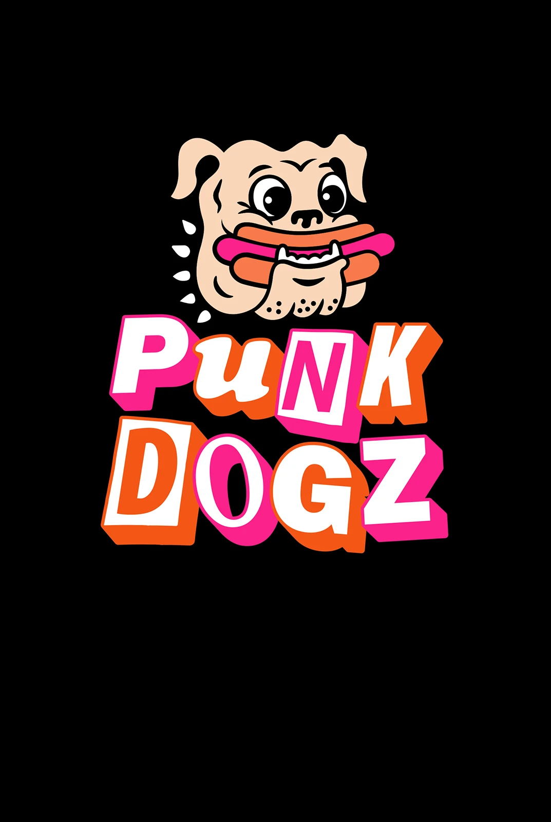 To boost merchandise sales, we created a striking logo featuring a cartoon dog gleefully munching a hot dog, paired with bold typography inspired by classic punk album art.