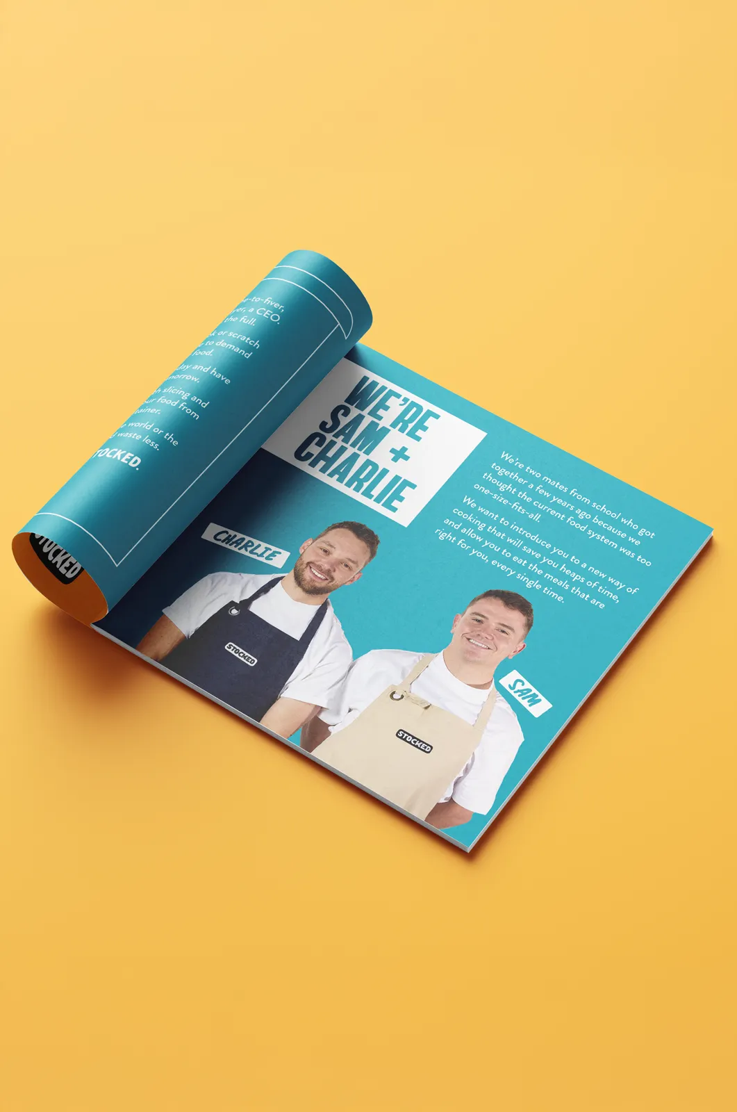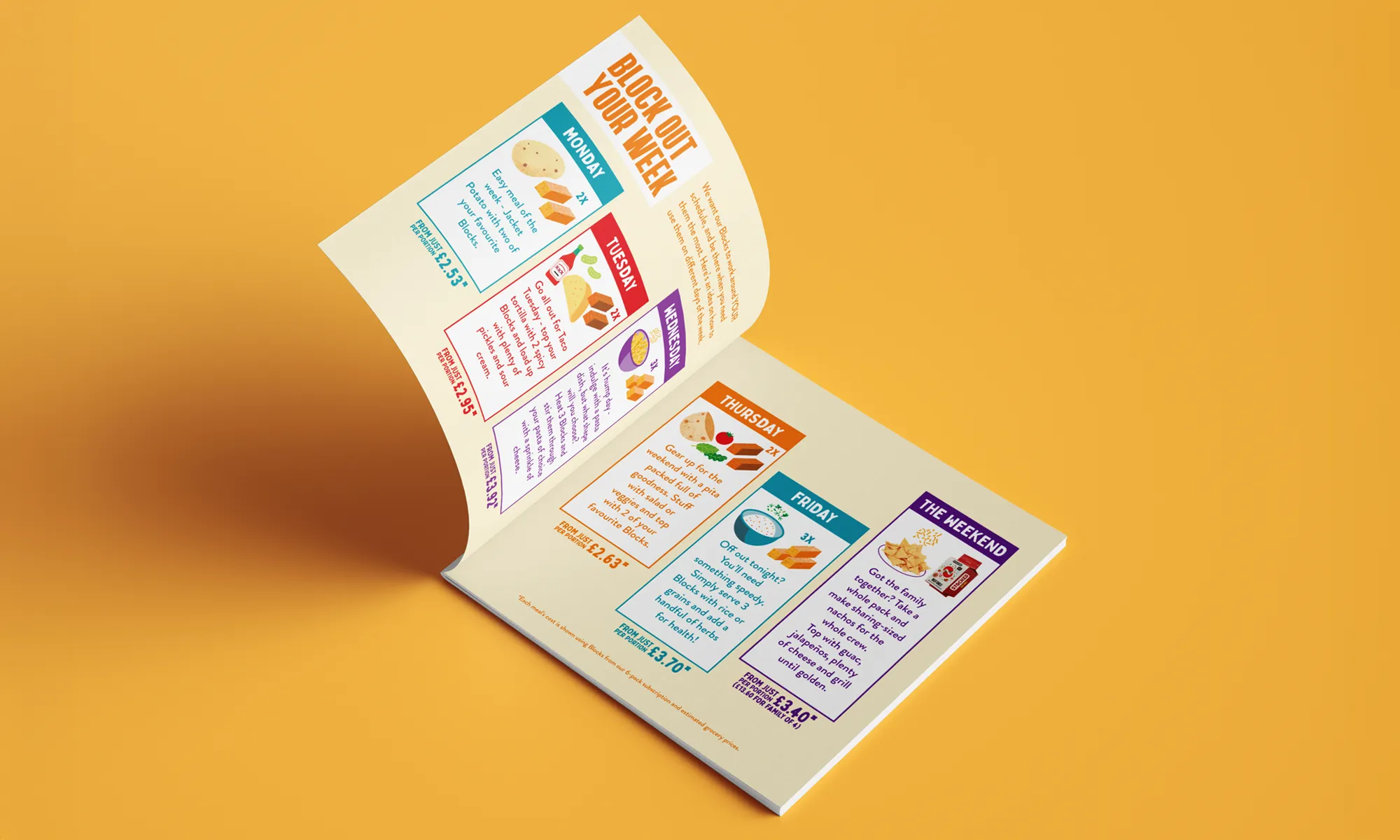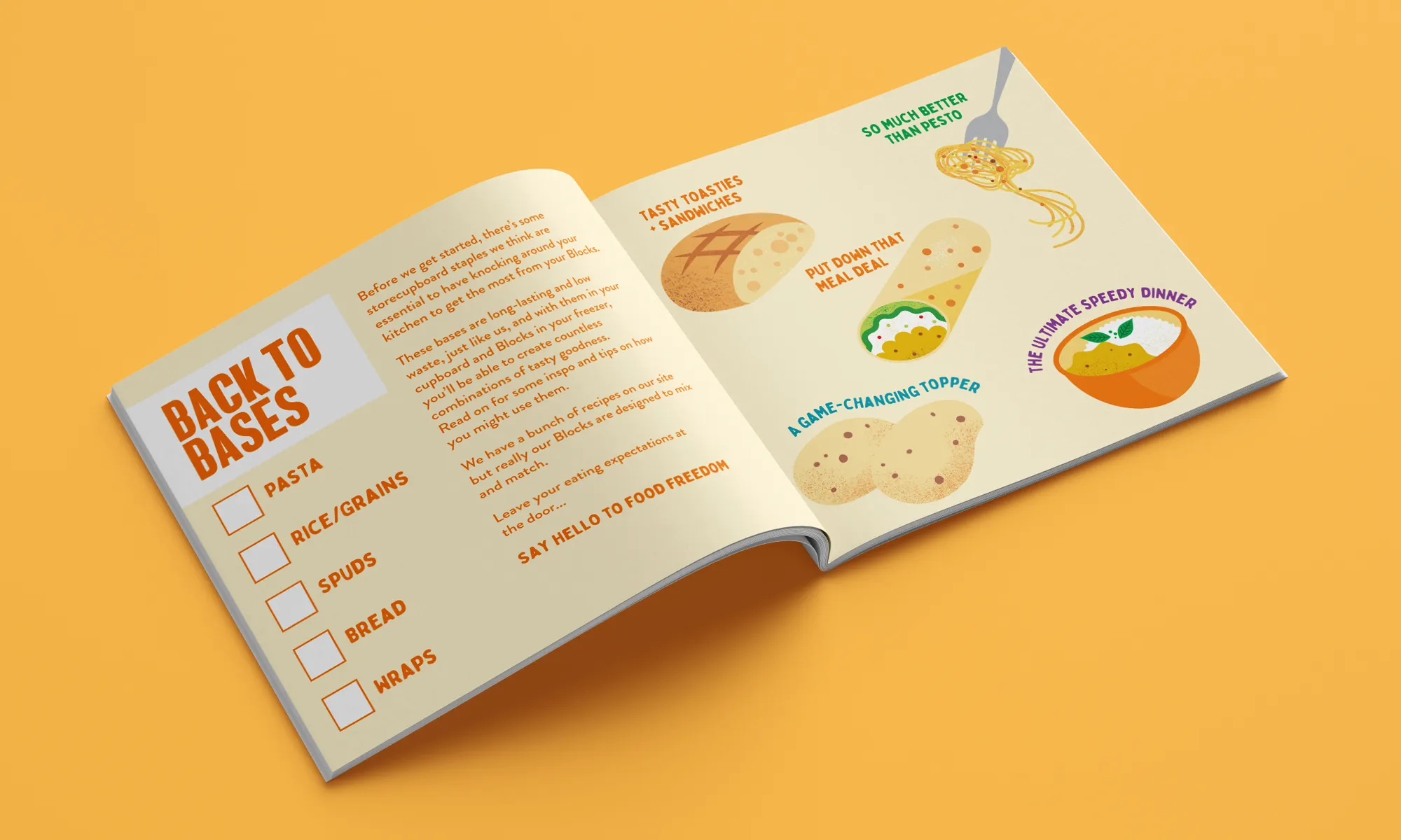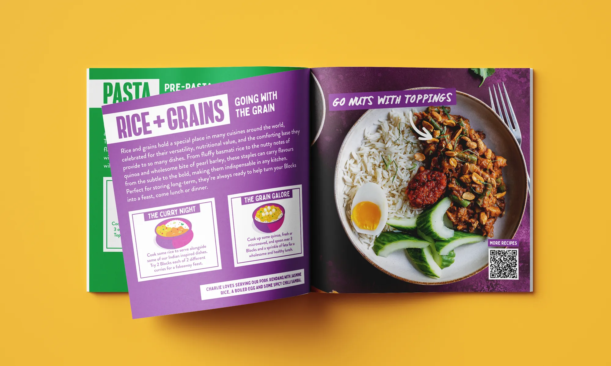 The booklet showcased illustrated recipes and meal ideas, highlighting creative ways to use the brand’s “blocks” – gourmet, pre-cooked meals that are delivered frozen and ready to heat.
