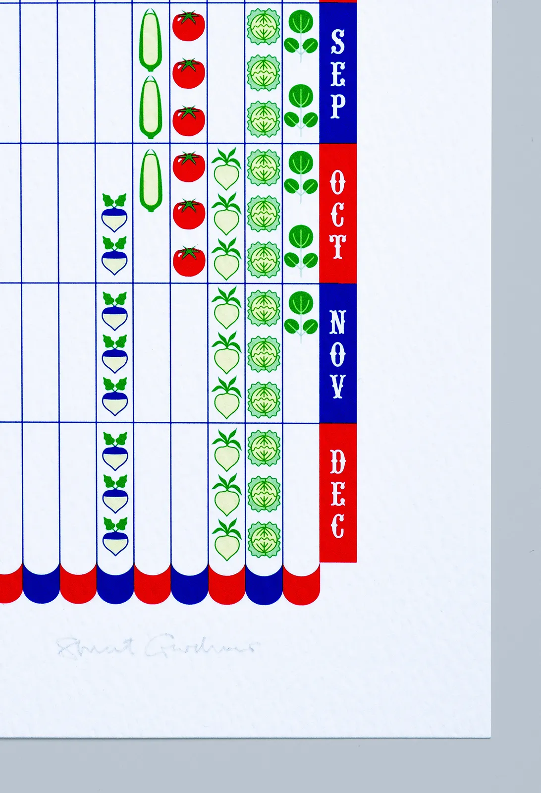 We created a limited-edition screen print of our Seasonal Guide to British Fruit & Vegetables — a month-by-month chart highlighting seasonal produce and echoing the exhibition’s sustainability message.